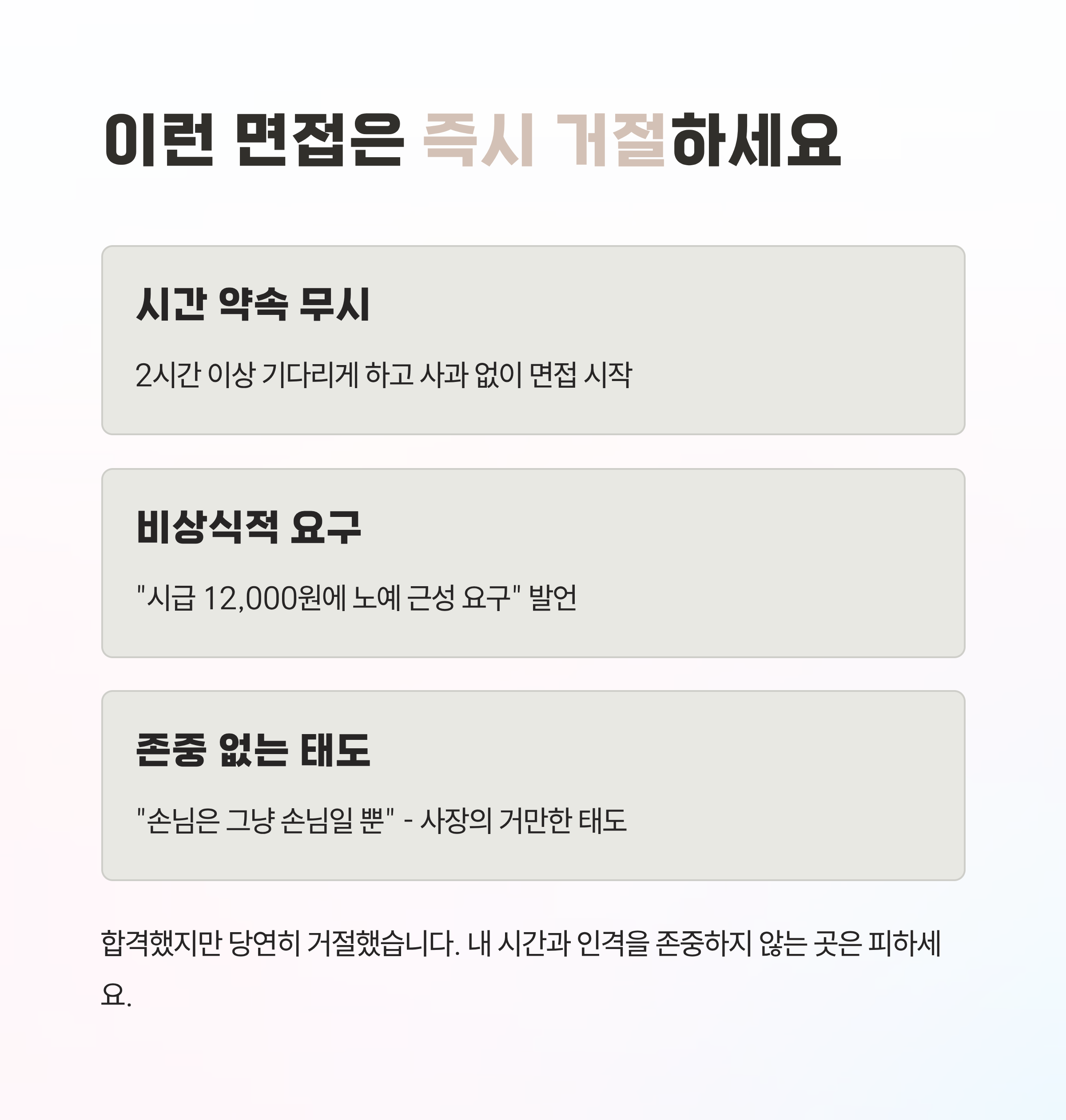 저도 모르게 헛웃음이 나왔습니다. 2시간을 기다리게 하고, 노예근성을 요구하고, 손님에게는 단호하게 대하라는 그 사장님이 저를 합격시켰다니요. 저는 당연히 정중하게 거절했습니다. 제 시간과 인격을 존중해주지 않는 곳에서는 일할 수 없다는 확신이 들었거든요.
